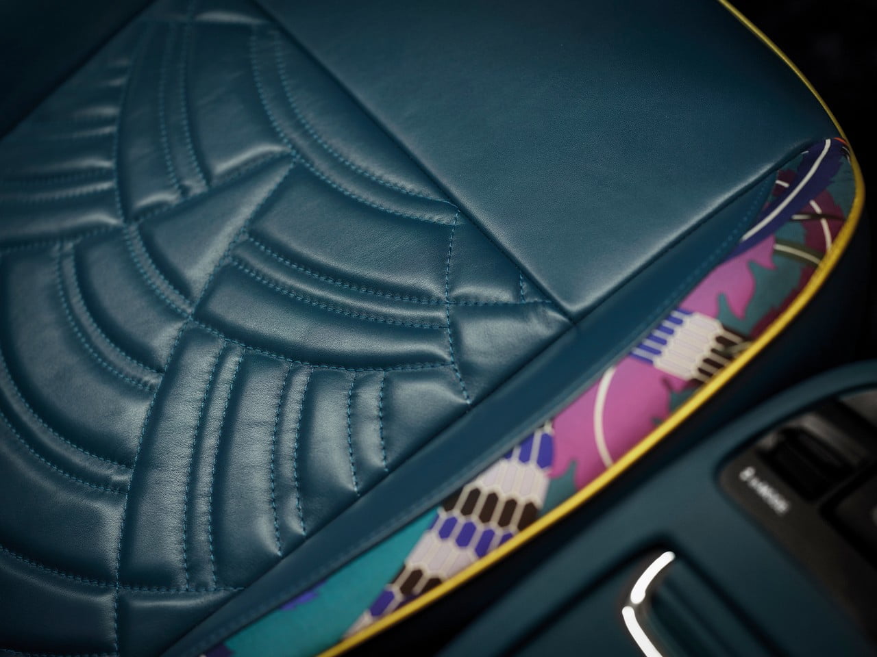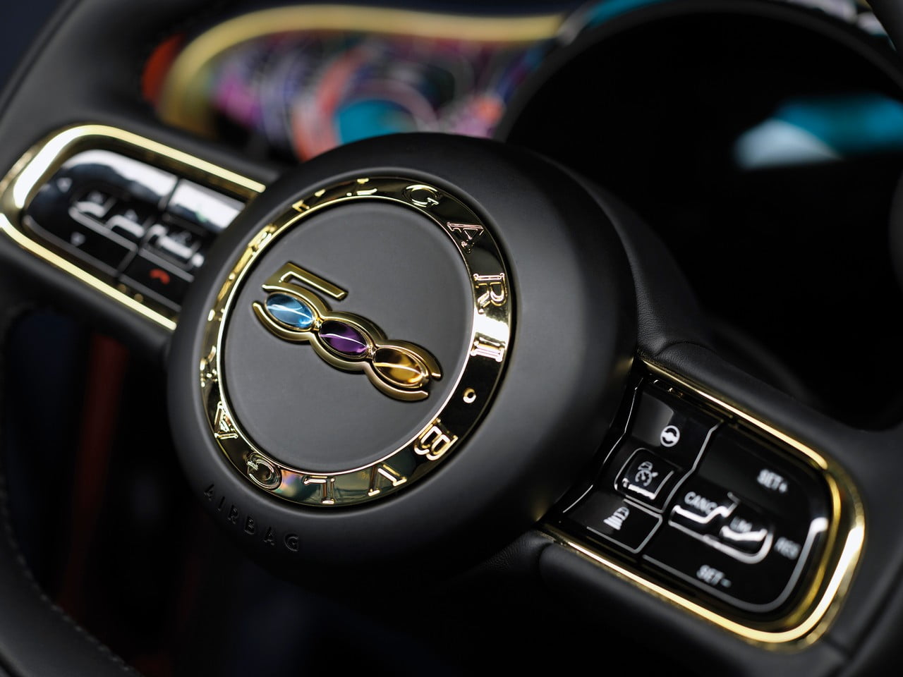 La Nuova 500 Bulgari è un'auto-gioiello, grazie agli interni realizzati in materiali pregiati impreziositi dalla cura dei dettagli e da finiture uniche che rievocano le vivaci combinazioni di colori e motivi inconfondibili e che celebrano le origini romane della Maison di moda.