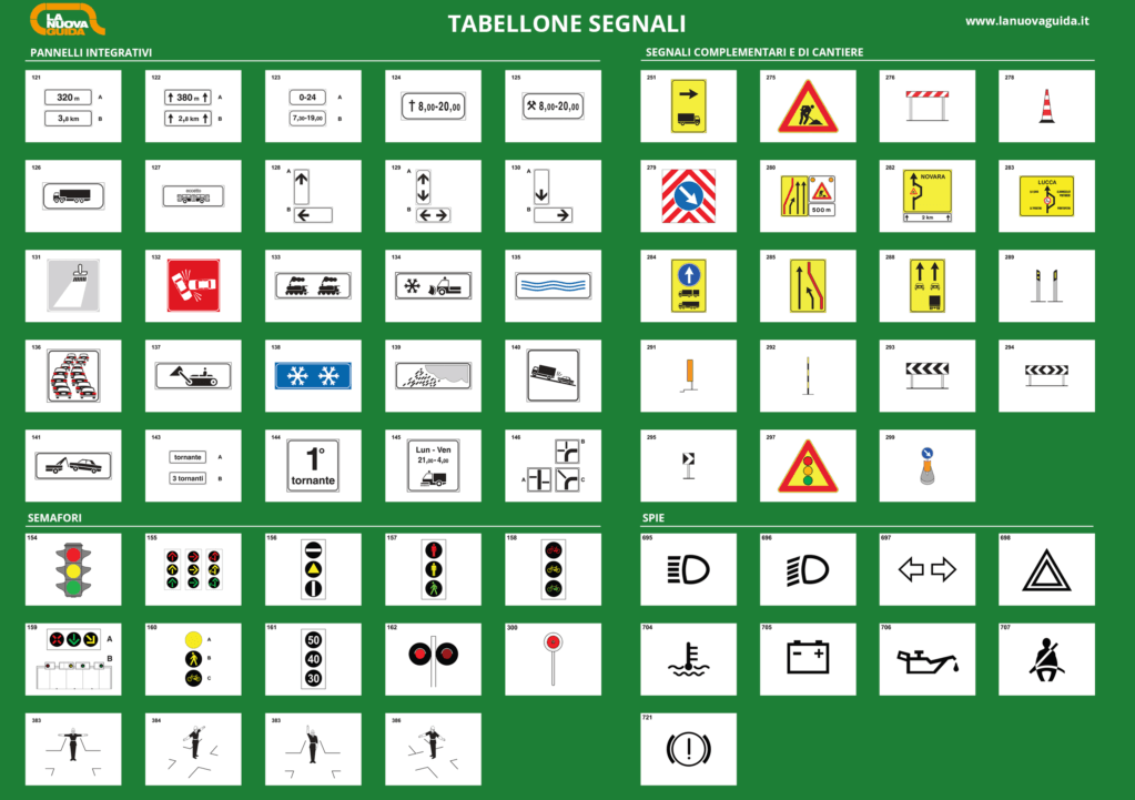 più ampia che vede nel suo sottoinsieme segnali di pericolo, i segnali di prescrizione, ovvero quelli di divieto, precedenza e obbligo, e i cartelli d’indicazione. La segnaletica verticale è posizionata sul lato destro della strada e può essere completata da pannelli integrativi al fine di riuscire ad avere una maggior comprensione del cartello