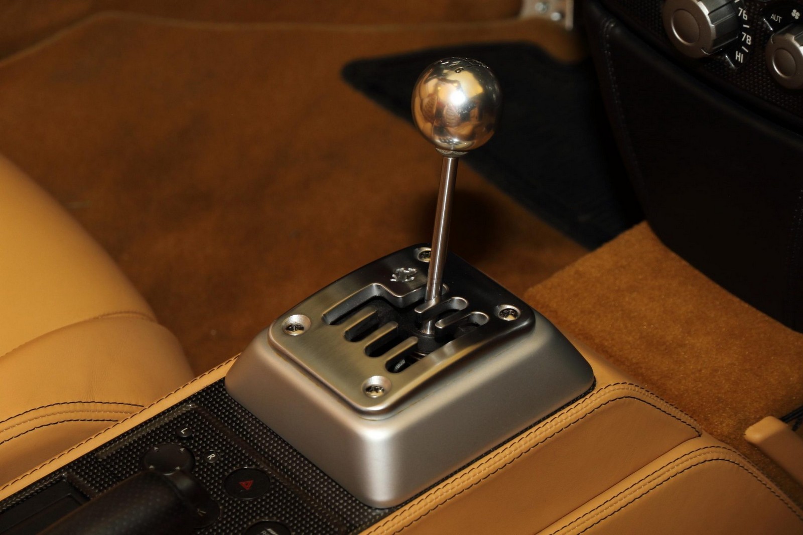 L’abitacolo di questa F430 si distingue per i sedili regolabili elettricamente in stile Daytona, rivestiti in pelle beige con dettagli neri e logo Ferrari in rilievo sui poggiatesta. Senza contare l’iconico cambio Ferrari, il climatizzatore automatico e il sistema audio Bose Premium.