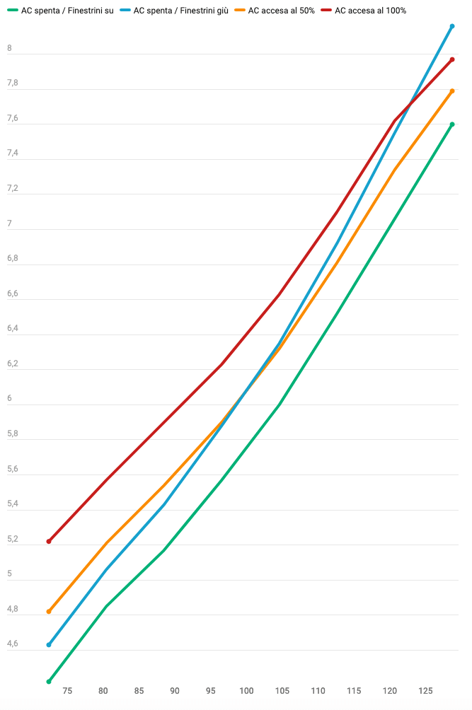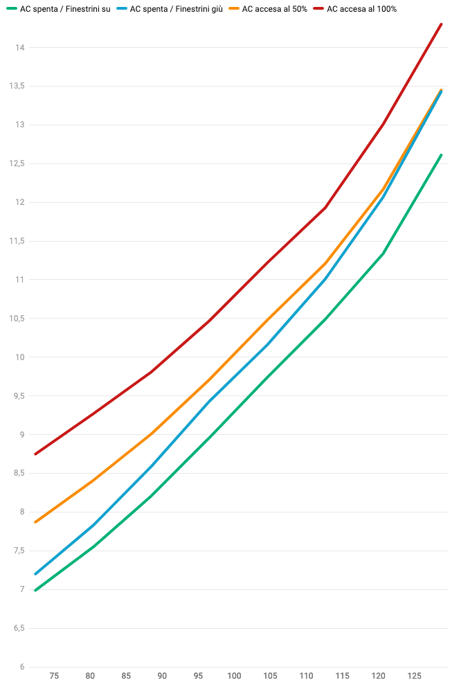 Come si può notare in un grafico, i consumi più bassi sono quelli associati ad aria condizionata spenta e finestrini alzati (illustrati dalla linea verde) una soluzione economica per i consumi, ma impossibile da praticare in estate, specialmente quest’estate dove si andava ben oltre i 50 gradi nell’abitacolo. A seguire troviamo i finestrini aperti (con la linea azzurra) che, a basse velocità, permettono di ottenere consumi piuttosto bassi e nettamente inferiori a quelli che si hanno con l'aria condizionata accesa. Questa tendenza, però, subisce una variazione attorno ai 100 km/h: a questa velocità la resistenza dell'aria inizia a diventare molto intensa, l'aerodinamicità del veicolo con i finestrini aperti è nettamente ridotta e, quindi, la soluzione più conveniente è l'aria condizionata al 50% della potenza (come illustrato dalla linea gialla). Questo permette di mantenere l'aerodinamicità e risparmiare carburante. La situazione cambia nuovamente attorno ai 125 km/h, quando anche l'aria condizionata al 100% (visibile sulla linea rossa) permette un risparmio di carburante più significativo che non con i finestrini aperti, che la rende perfetta per i lunghi viaggi delle vacanze.