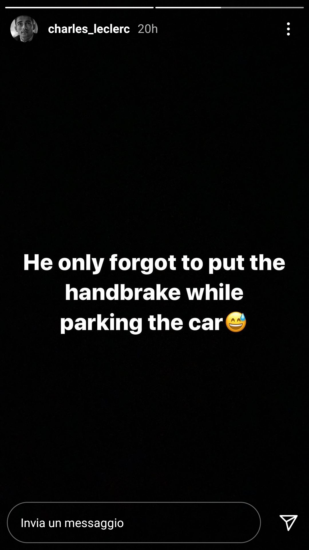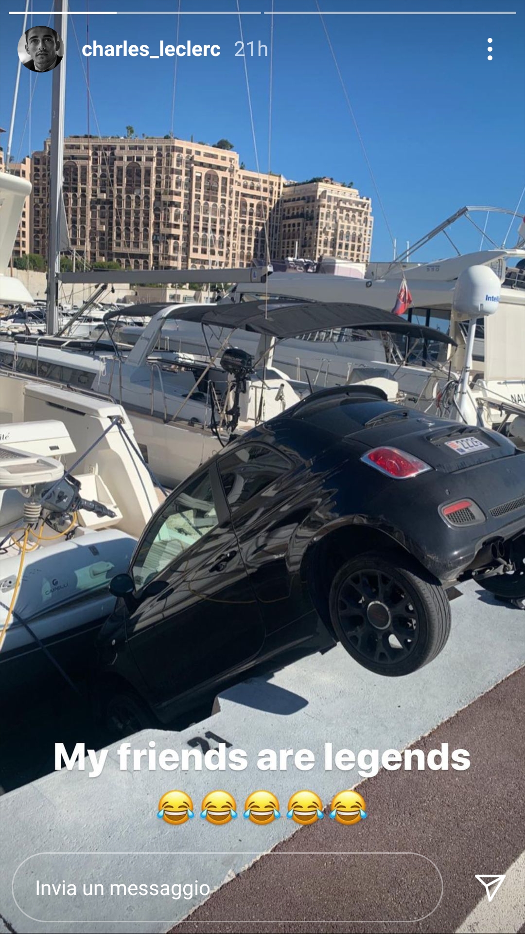 Ieri, infatti, sulle storie del profilo Instagram del pilota ferrarista sono comparse due foto: una ritrae una povera Fiat 500 messa quasi “a testa in giù” nel porto di Montecarlo, l’altra la causa del misfatto, riferito al suo amico un po’ sbadato: “Si è solo dimenticato di mettere il freno a mano nel parcheggio”...e che parcheggio.