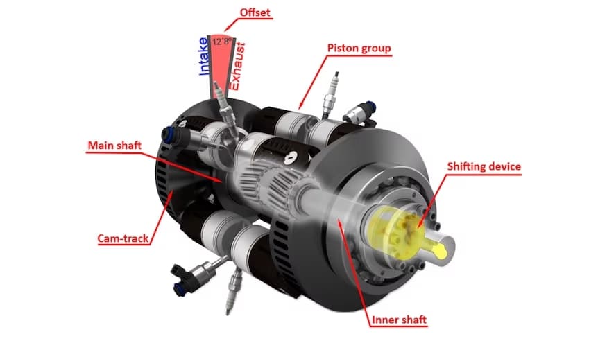 Stiamo parlando di un motore piccolo, con appena 500 cc di cilindrata, ma quattro cilindri, a otto pistoni opposti. La cosa che rimane più particolare è il cinematismo che li governa: addio a bielle e alberi a gomiti, qui l’ingegnere ha preferito inserire una sorta di doppia albero a camme su cui i pistoni agiscono con appositi cuscinetti. Da questo ne deriva una struttura estremamente compatta e maggiormente equilibrata, dove le masse si muovono in simmetria.