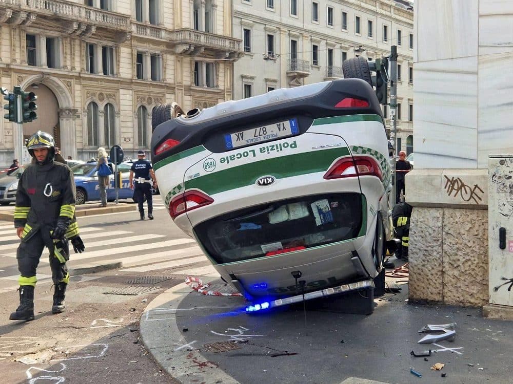 La vettura della Polizia Locale è finita contro la Ferrari 430 che sopraggiungeva, e contro il motorino, per poi ribaltarsi travolgendo alcuni segnali e fermandosi dove si trova il cartello che segnala l'inizio dell'Area C.