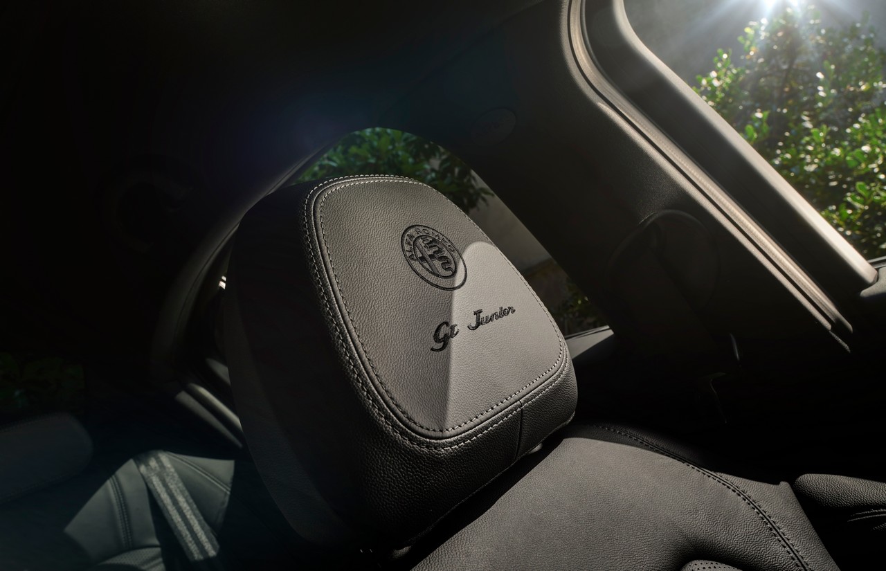Alfa Romeo Stelvio GT Junior, sempre distinti da un DNA sportivo, ospitano di serie sedili in pelle regolabili elettricamente e dotati del ricamo specifico "GT Junior" sui poggiatesta anteriori. Oltre a impunture specifiche, mentre sulla plancia spiccano un elegante ricamo e silhouette della GT 1300 Junior degli anni '60.