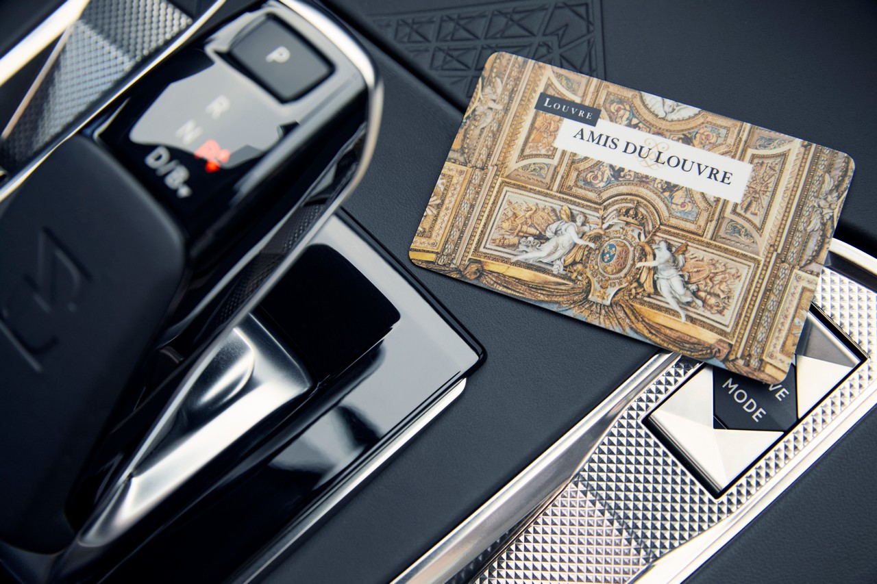 I codici stilistici del museo sono stati trasposti dagli artigliani DS in varie parti della vettura: dal cofano, con specifici badge “Louvre”, sul portellone del bagagliaio e sulle porte anteriori. Le DS Wings sulla calandra, il contorno dei finestrini, le barre al tetto e le decorazioni delle luci posteriori sono invece caratterizzate da una decorazione Gloss Black. Un altro tocco di grande manifattura si trova sulle calotte degli specchietti, dove è presente un’incisione laser riportante il motivo della famosa piramide in vetro del Louvre. All'interno, il motivo della piramide di Ieoh Ming Pei è utilizzato elegantemente attraverso una stampa 3D sulle prese d'aria, sul cruscotto e con una goffratura applicata sulla pelle Nappa del coperchio del vano portaoggetti centrale.