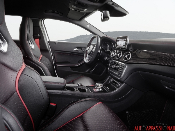 Come in tutte le vetture ad alte prestazioni AMG anche l'abitacolo della GLA 45 AMG propone un fascino sportivo e dettagli esclusivi. Le dotazioni comprendono sedili sportivi in pelle ecologica ARTICO/microfibra DINAMICA impreziositi da cuciture di contrasto rosse, cinture di sicurezza rosso designo e DRIVE UNIT AMG. Il volante sportivo multifunzione a tre razze in pelle Nappa, appiattito nella parte inferiore, con cuciture di contrasto rosse e traforato all'altezza dell'impugnatura con i comandi del cambio integrati consente un perfetto controllo della vettura. Per tenersi sempre informato il guidatore ha a disposizione la strumentazione AMG con 2 quadranti incluso display centrale a colori, menu principale AMG e RACETIMER. Quando si apre la porta, il guidatore viene accolto dalla videata iniziale AMG. L'inserto sulla plancia è realizzato in alluminio spazzolato e, insieme alle soglie d'ingresso AMG anteriori in acciaio legato spazzolato, sottolinea l'atmosfera raffinata ed esclusiva a bordo della GLA 45 AMG.