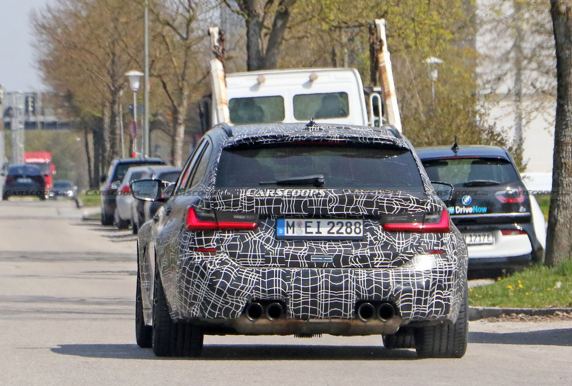 La vettura ad alte prestazioni presenta all’anteriore tutte le modifiche già presenti su M3, il frontale sarà dunque derivato da quello della Serie 4 con appendici aerodinamiche e prese d’aria specifiche per il modello più prestazionale. La vista laterale è ancora pesantemente camuffata e non è possibile individuare eventuali novità stilistiche, rimane ad ogni modo ben evidente lo sfogo d’aria dietro la ruota anteriore per far fluire l’aria in pressione sopra le ruote. Il posteriore è chiaramente la vista più interessante di questa nuova M3 Touring, ciò che si vede è un perfetto mix tra gli elementi “M”, ben riassunti dall’imponente scarico a 4 terminali, ed elementi della classica Serie 3 Touring. Il volume posteriore riprende da vicino il modello standard, ciò significa che possiamo aspettarci lo stesso spazioso bagagliaio da 1.510 litri.