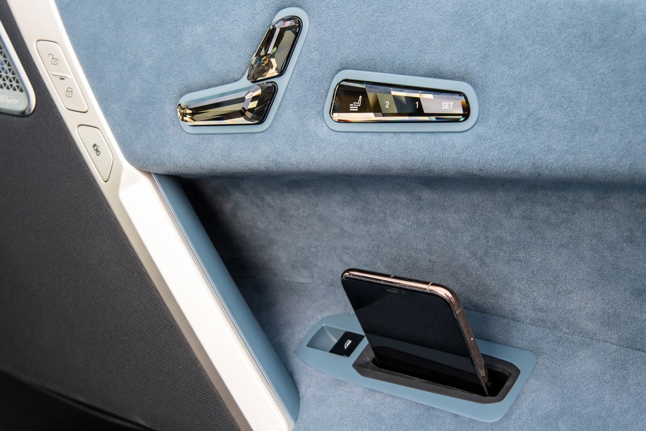 Ai lati? I vani portiera propongono sulla vettura da noi provata i comandi per la regolazione elettrica dei sedili, sempre a effetto cristallo e, utilissima, una piccola "tasca" per riporre lo smartphone del passeggero. Questa la portiera di destra, poichè questa piccola ma utile chicca manca da quella del guidatore, mentre entrambe si aprono non con la classica maniglia ma con un apposito pulsante. Il telefono può tranquillamente stare in tasca ma, volendo, può essere accomodato su un'apposito spazio ricavato sull'isola centrale. Sotto di essa, c'è la piastra di ricarica wireless dove, se volete configurare il vostro smartphone come la nuova chiave della vettura, perchè si può fare, deve essere posizionato per avviare i motori elettrici e partire.
