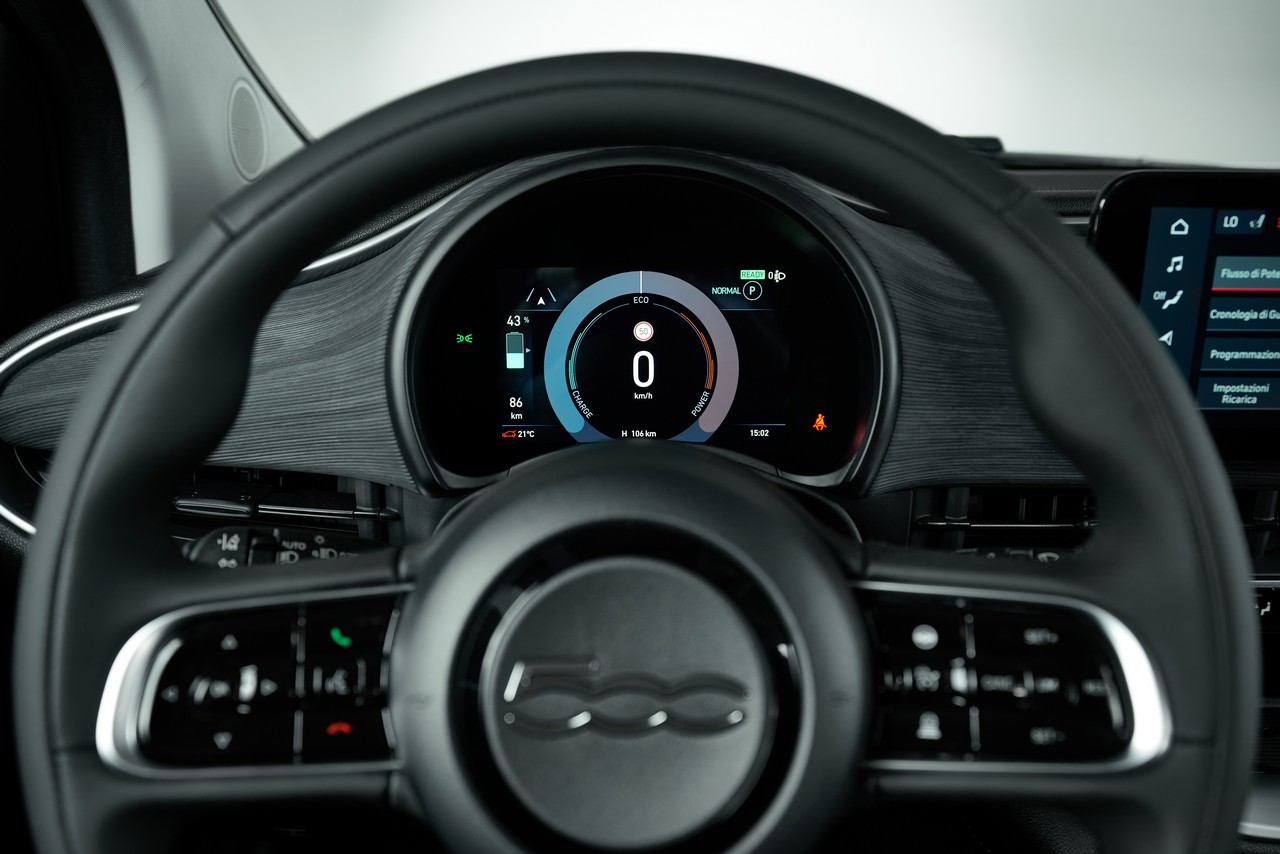 Partiamo, anche questa volta, dalla entry level. La 500 @Action equipaggiata con un e-motor da 70 kW capace di accelerare la vettura da 0 a 100 km/h in 9,5 secondi, con velocità autolimitata a 135 km/h. La sua batteria, con capacità di 23,8 kWh che consente un’autonomia maggiore di 180 km con ciclo WLTP, che superano i 240 nell’uso urbano. E calcolando che, mediamente, un uso giornaliero si attesta sotto i 50 chilometri, vuol dire che il cliente avrà bisogno di caricare la sua nuova 500 non più di 2/3 volte alla settimana.