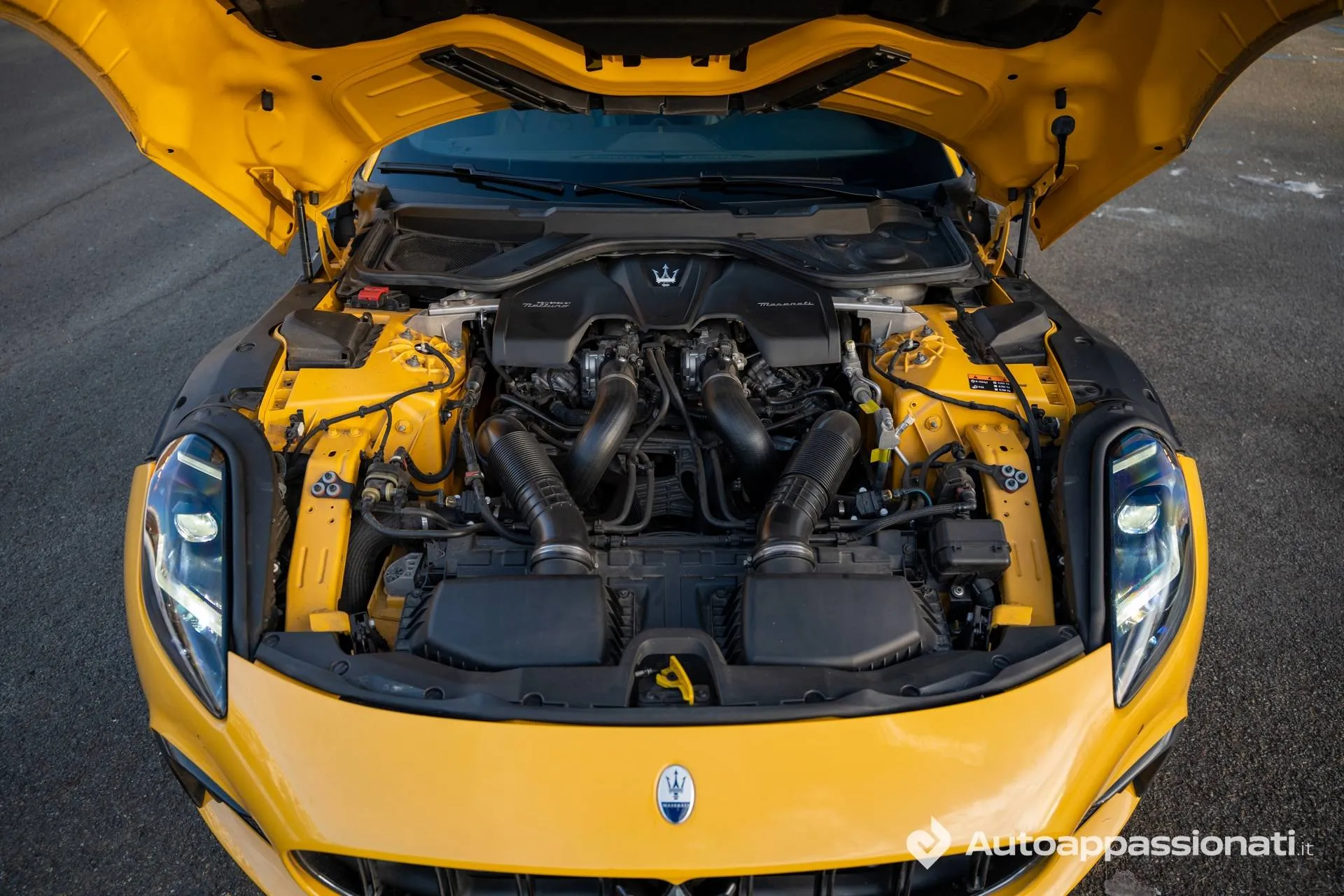 La vettura in prova è ulteriormente impreziosita dalla livrea Back To Modena che riprende i colori della città emiliana per festeggiarne il ritorno “a casa” e realizzata dalla Bottega Fuoriserie, il progetto di personalizzazione della Casa del Tridente. La verniciatura di base è il Giallo Genio, che fa parte del progetto Fuoriserie nella collezione Futura, un colore giallo metallizzato tristrato con riflessi bianchi da 15.250 euro. Ad impreziosirlo, poi, ci sono i dettagli in blu sulla fiancata, con il Tridente e un pentagramma che richiama l’eredità nella musica lirica di Modena. Per avere una GranTurismo come questa, quindi, servono circa 250.000 euro.