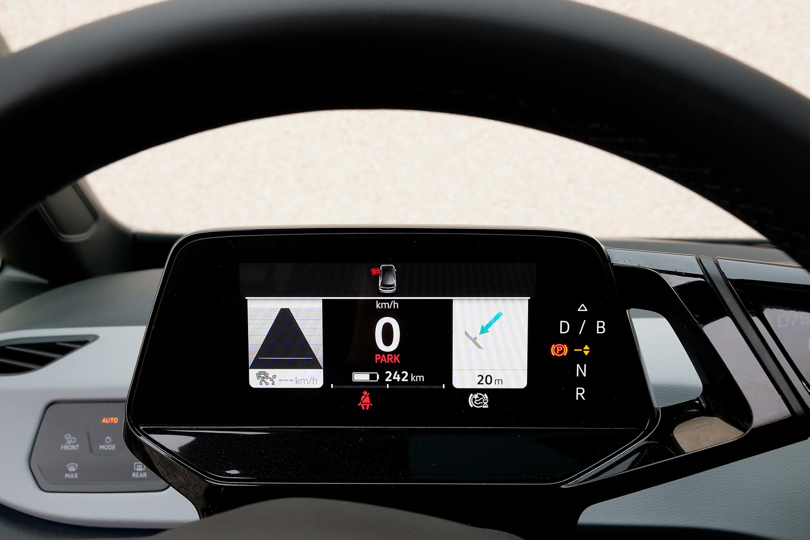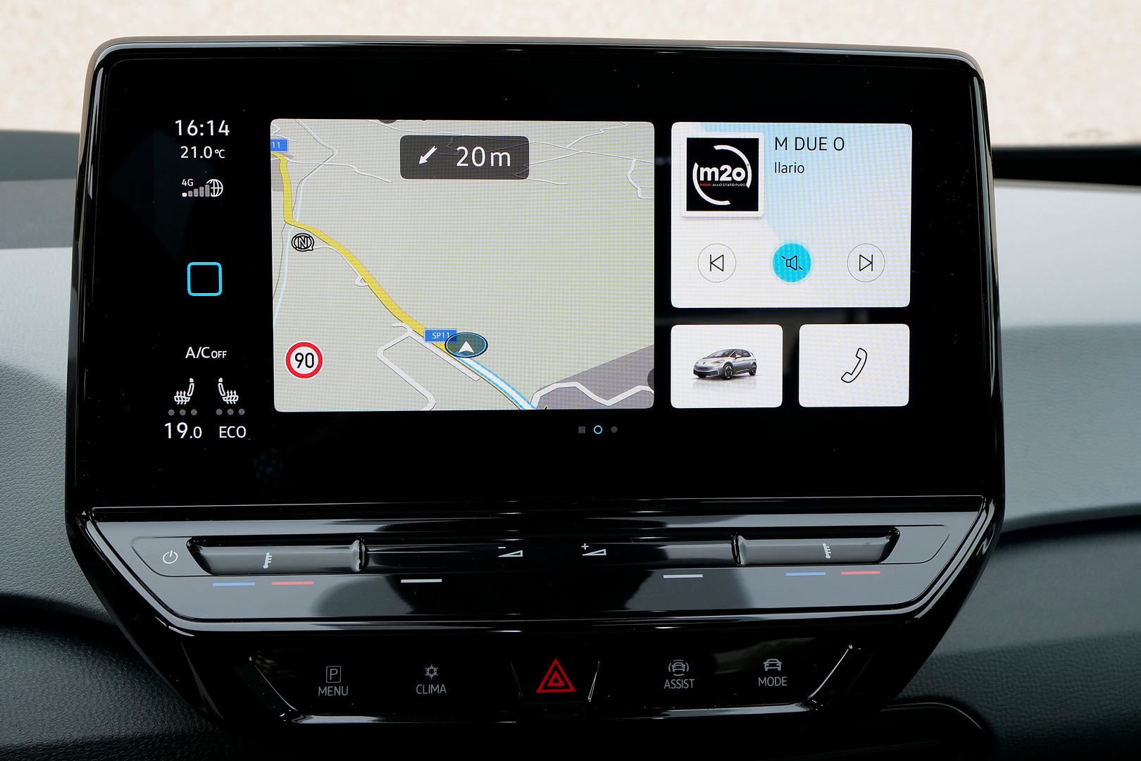 Inoltre, ce ne sono altri alla base e alla sinistra dello schermo di 10” nella consolle, con i quali si controllano alcune funzioni del clima automatico e si accede velocemente a schermate del sistema multimediale. Non c’è nemmeno un classico cruscotto, perché lo schermo è solidale al piantone: indica velocità e autonomia residua, mostra le indicazioni del navigatore satellitare (ma non la mappa) e fa vedere se è attivo o meno il sistema di guida assistita.
