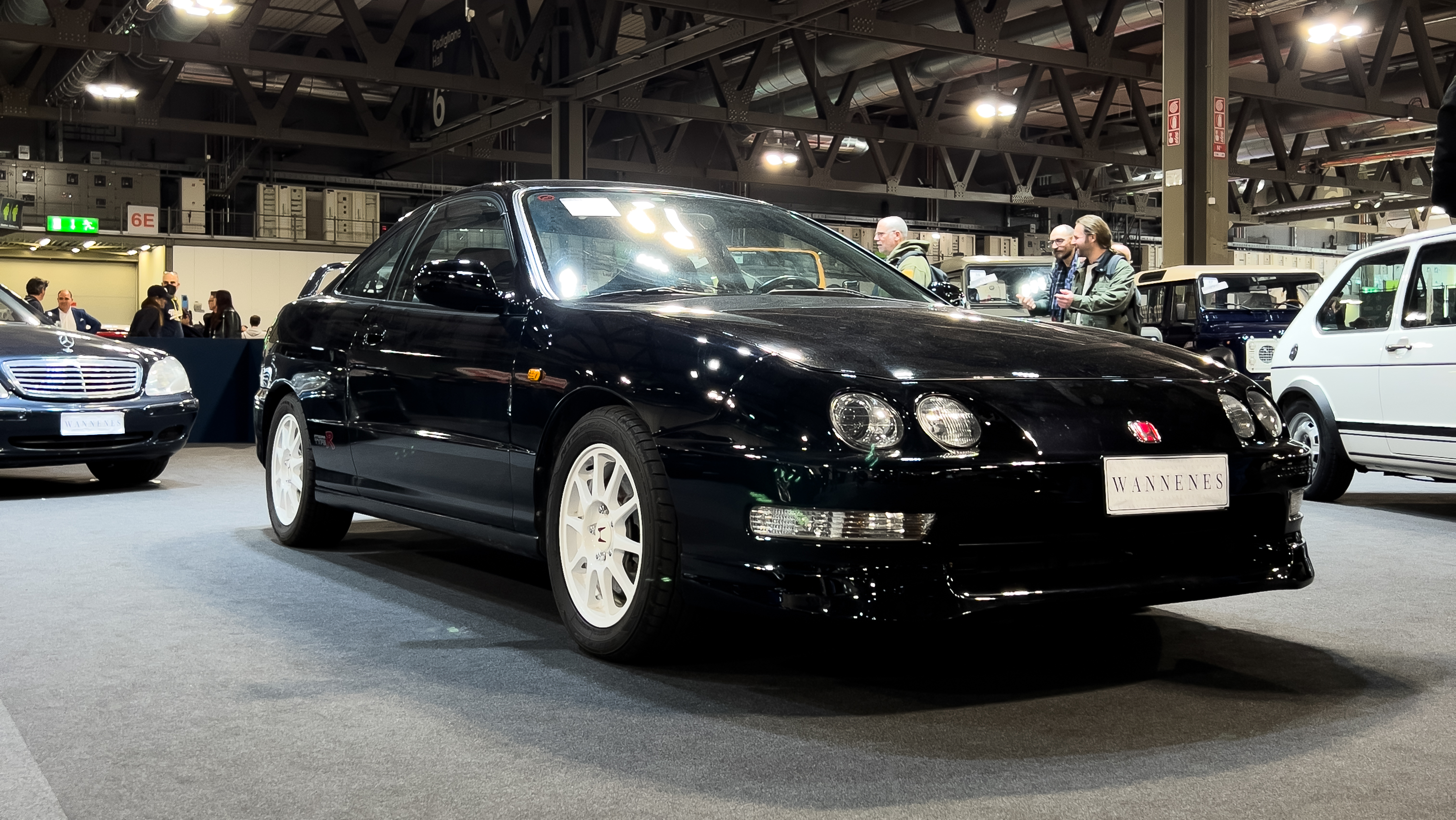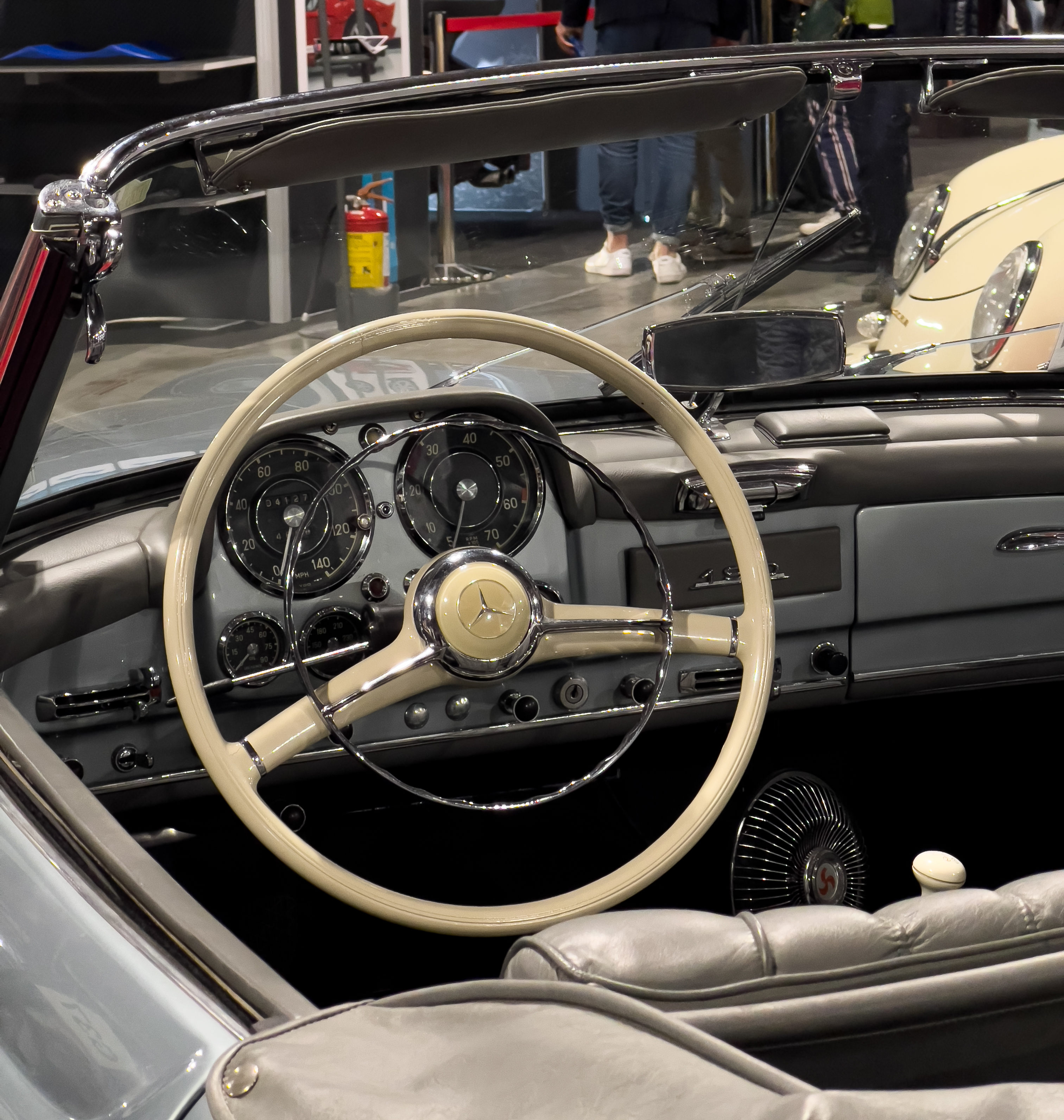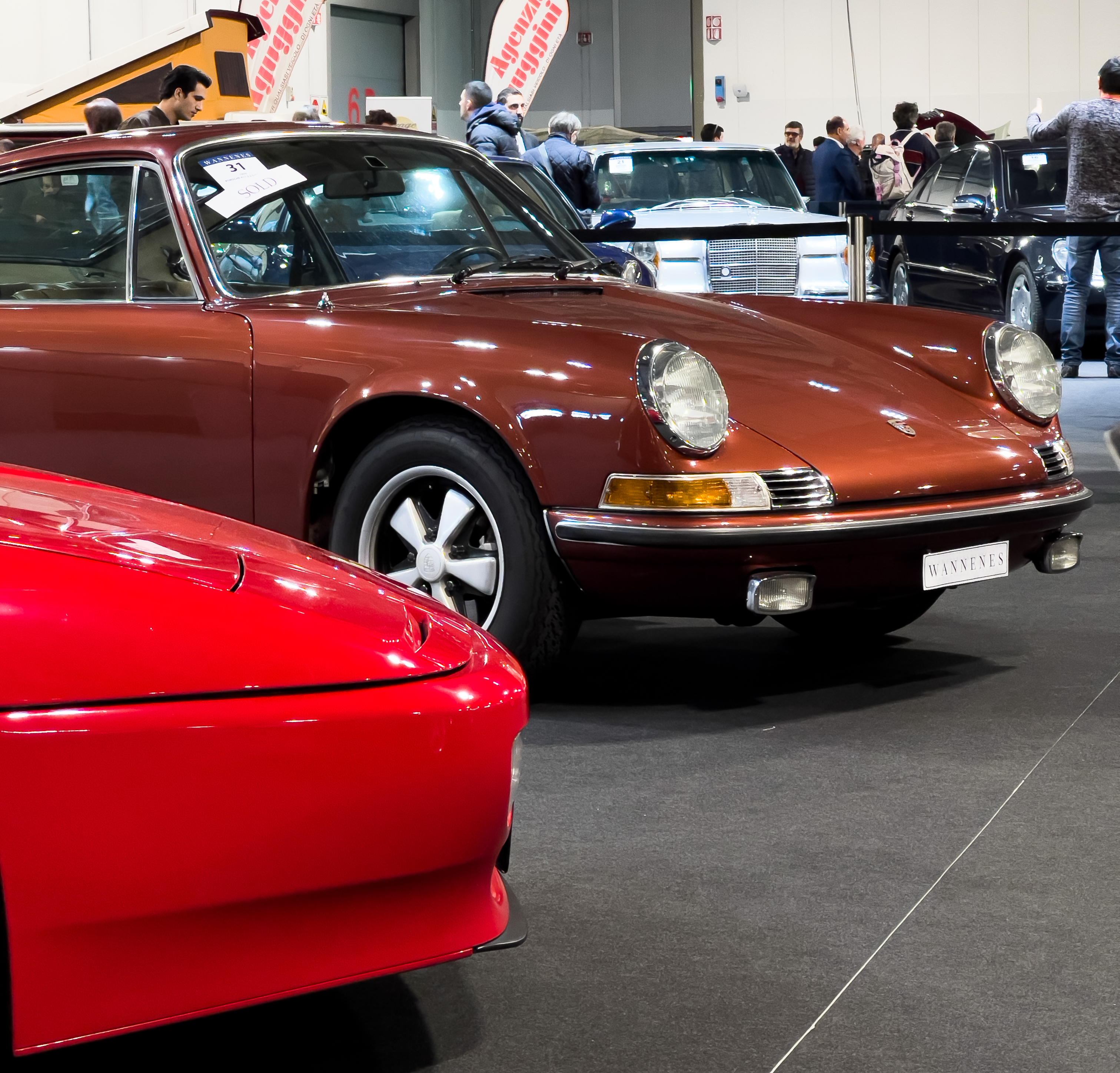 Poco distante da questa perla rara si poteva ammirare uno dei pochi esemplari di Peugeot 205 Rally, piccolo baluardo di “francesità” insieme ad una Clio V6, una rara Citroen C6 e qualche Citroen DS. Un assaggio moderato di Francia in una fiera dominata da auto italiane e tedesche. Elegantemente ben distribuite sul territorio della fiera, a formare colonie qua e la, anche diverse britanniche, per lo più sinuose ed affascinanti Jaguar e per lo più E-Type maniacalmente restaurate e ben tenute, spesso in mostra con il cofano aperto (rigorosamente al contrario). Non mancavano comunque diversi Defender ben restaurati ad accompagnare le poche Land Rover presenti nelle sale.