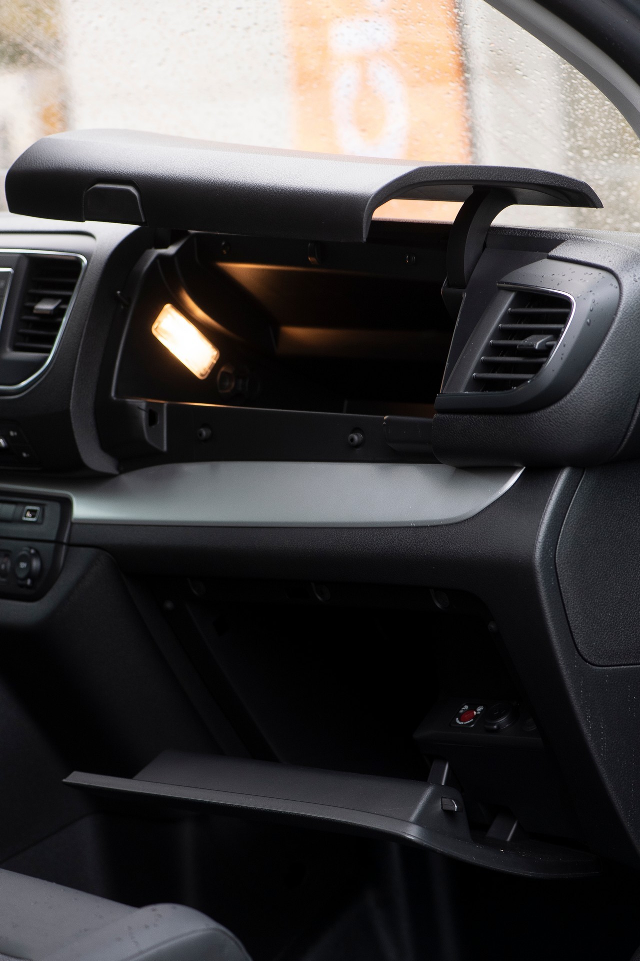 Apple CarPlay e Android Auto, mentre si rende molto utile il vano piuttosto ampio, con luci interne, per riporre i vostri documenti. Alcune novità si notano invece a livello del comando del cambio, automatico, e del freno a mano. Sparisce la leva, sostituita da una piccola levetta retro-illuminata, così come sparisce la rotella (presente, ad esempio, sulla versione Diesel di Jumpy) che viene sostituita dallo stesso sistema che oggi troviamo su nuova Citroen C4, compreso il pulsante “B” che permette, una volta premuto, un maggior recupero energetico, sicuramente funzionale tra le frequenti frenate dell’ambiente urbano dove operano questo tipo di veicoli.
