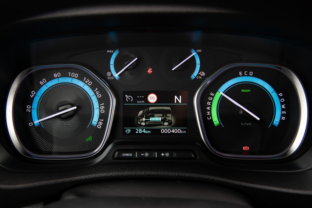 Il quadro strumenti, invece, cambia conformazione e pur rimanendo analogico diventa più colorato grazie all’indicatore della potenza (in verde il Charge, dove la lancetta si muoverà quando lascerete il pedale dell’acceleratore), l’indicatore della velocità e in alto, della capacità residura della batteria (a destra) e dell’impatto della climatizzazione sui consumi (a sinistra). Al centro, il piccolo schermo da 3,5” dove scorrere le schermate e monitorare, ad esempio, i consumi. A lato, in posizione centrale, il touchscreen da 7" con Apple CarPlay e Android Auto di serie.